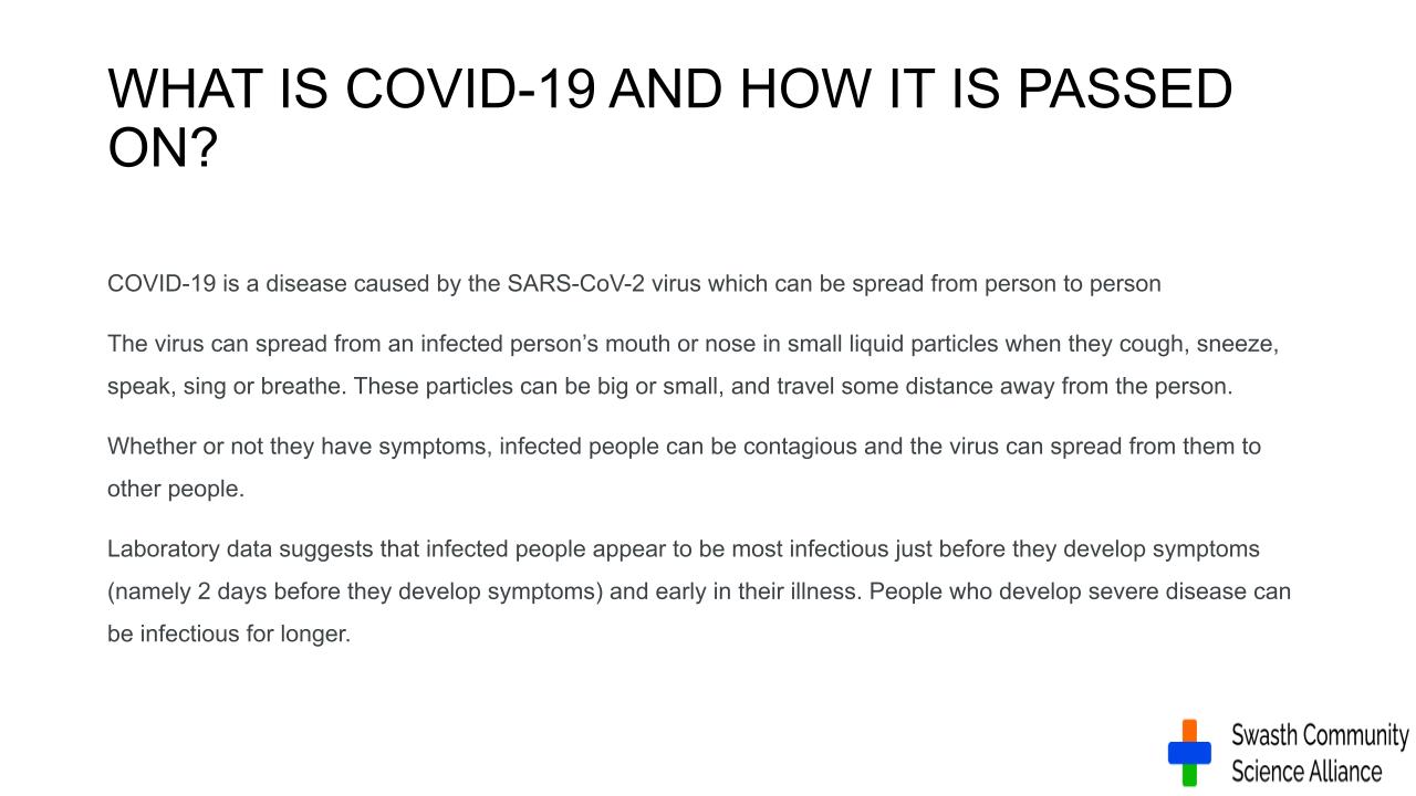 What is COVID and how is it passed on Swasth Community Science Alliance (SWASTH):
